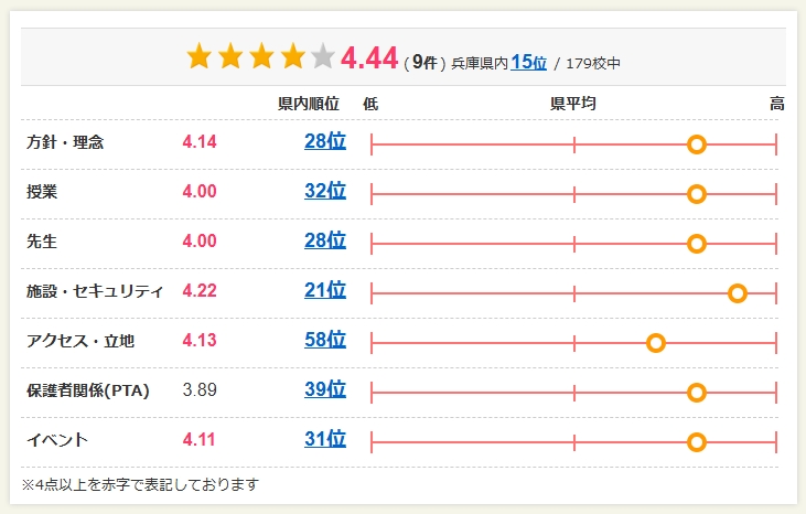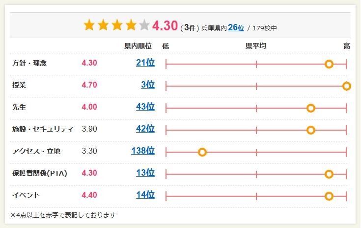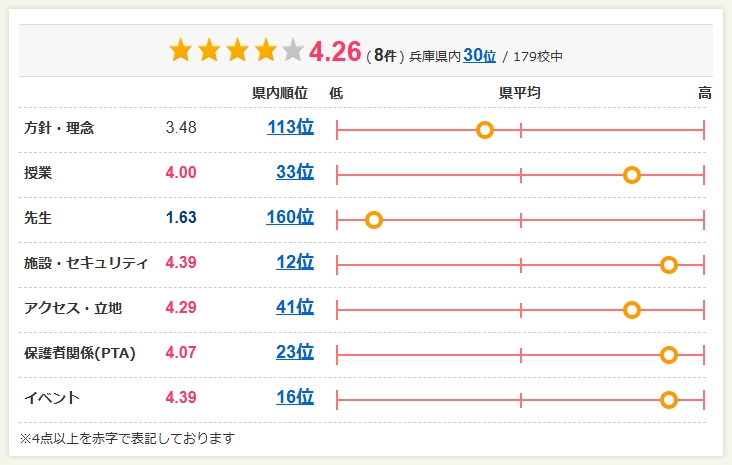 全体的な評価は第3位ですが、先生の評価が目立って低いところが気になります。